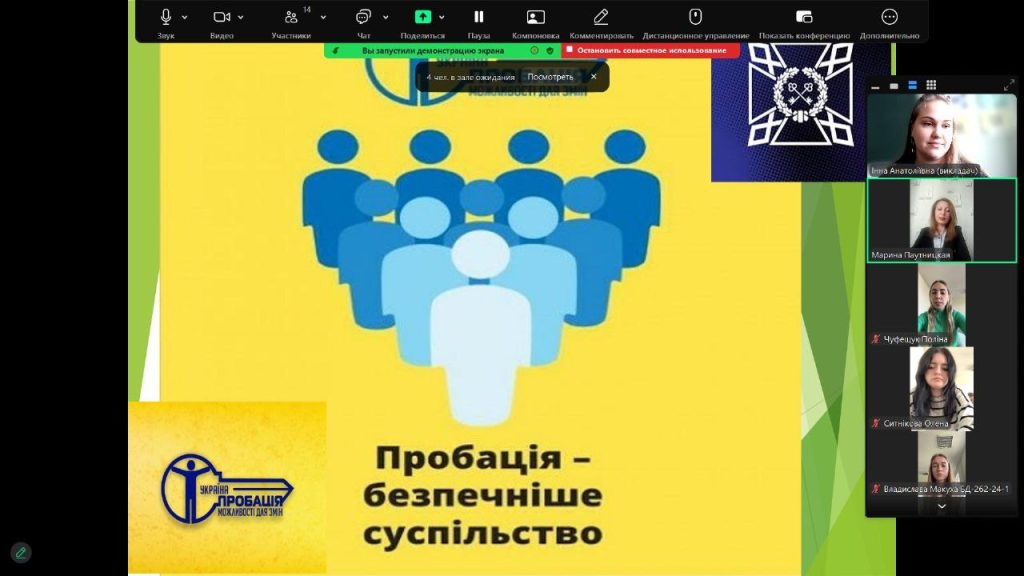 У ході лекції було розкрито роль та переваги пробації як сучасного інституту, спрямованого на підвищення безпеки суспільства. Спікерка ознайомила студентів із видами пробації, категоріями осіб, до яких вона застосовується, а також зупинилася на ключових поняттях візії, місії та цінностей пробації.