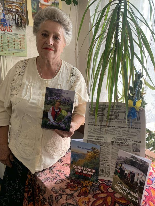 Ніна Миколаївна споріднена мені душа тим, що дуже шанує нашу «Зорю» і досить творча людина. Вона за останні два роки (2024 – 25р.р.) написала три книжки і випустила їх у світ. Перша – «ЛЮБОВ – МОЯ ДІБРОВА». Друга – «СПІВУЧИЙ ОБРІЙ СЕЛА». Третя, але не остання, – «КОЛИ ГОРІВ МІЙ КРАЙ ВОГНЕМ». Їх треба тільки читати, а «Зоря інфо» друкуватиме твори своїх бойових і творчих помічників.