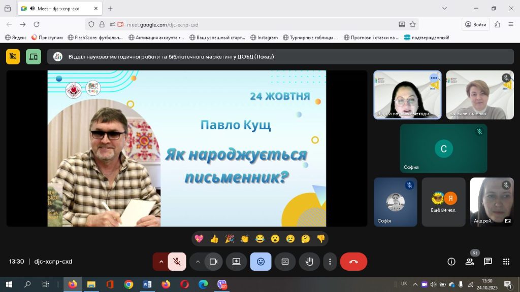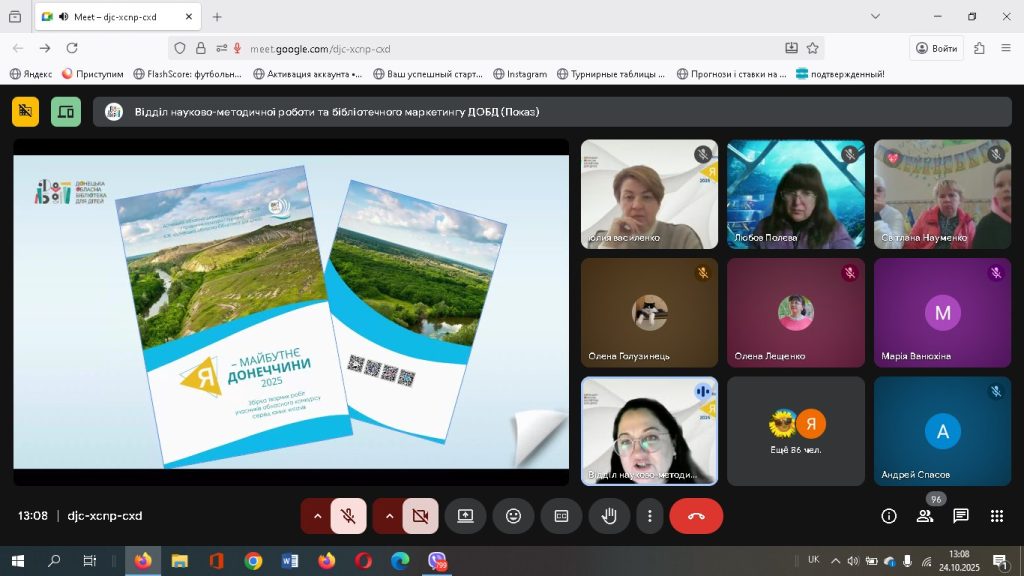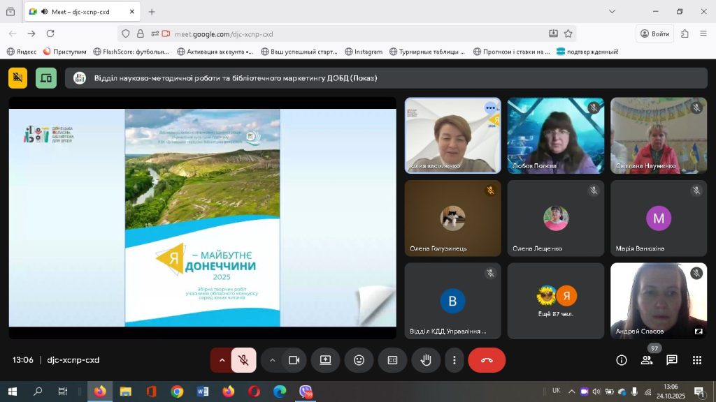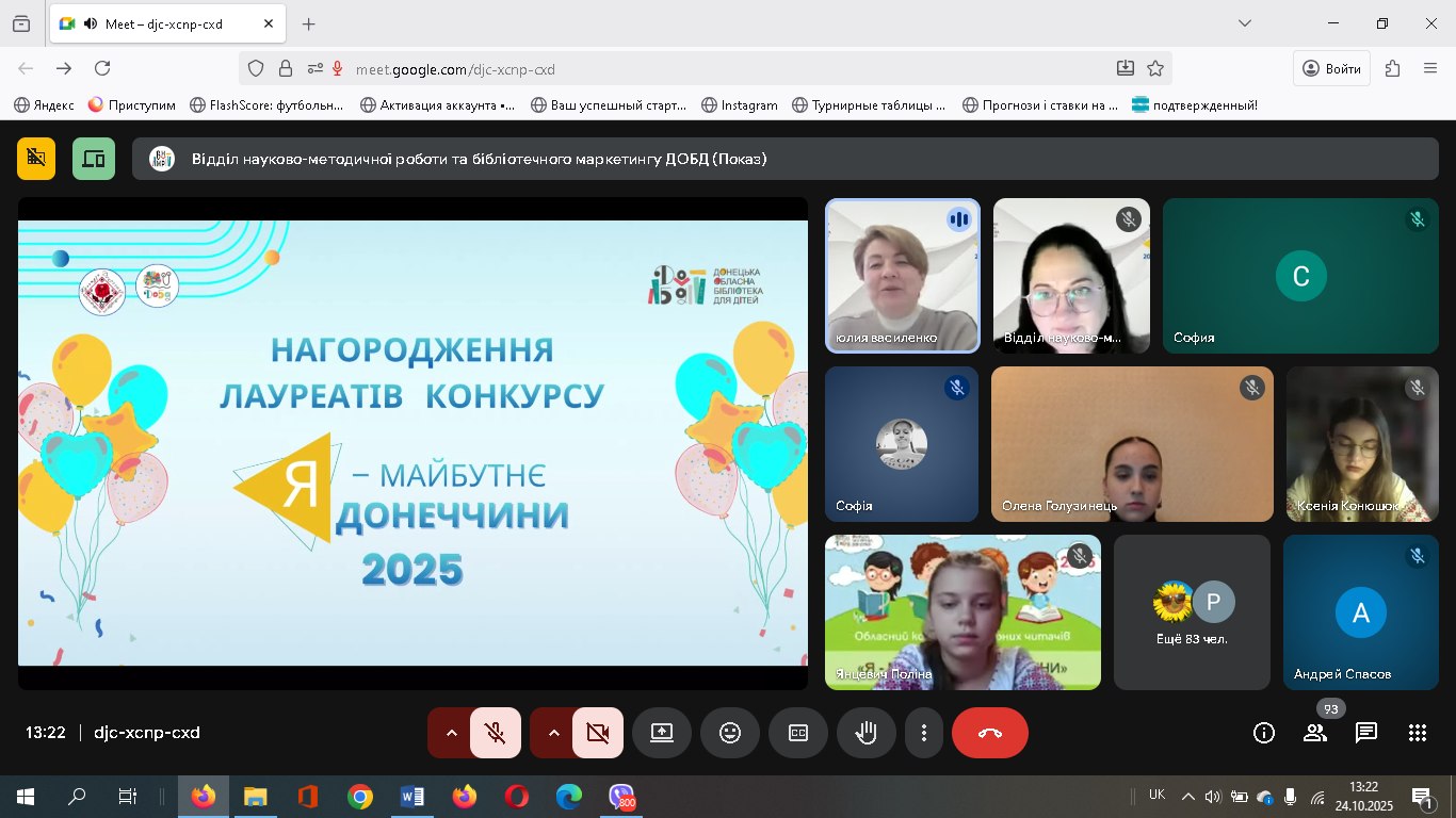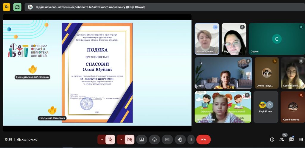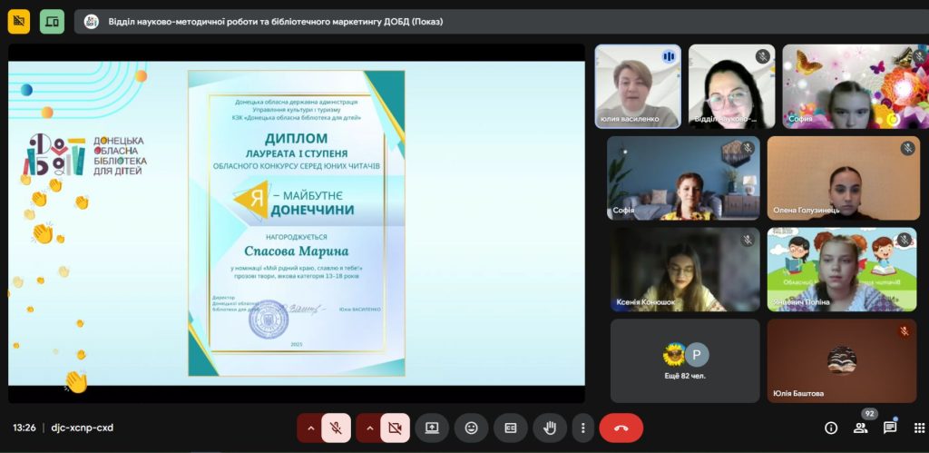 Бібліотека для дітей ім. Т. Г. Шевченко Публічної бібліотеки Лиманської громади разом з учасницею конкурсу були запрошені на урочисте свято нагородження лауреатів конкурсу “Я – майбутнє Донеччини”. Онлайн-формат заходу дав змогу об’єднати учасників із різних куточків області, створивши атмосферу єдності, підтримки та натхнення. Теплі слова, щирі емоції й вдячність звучали від учасників і гостей події. Запрошений на захід гість – письменник Павло Кущ поділився з учасниками своїм творчим шляхом та відповів на всі запитання. На завершення організатори подякували всім, хто долучився до конкурсу, побажали юним авторам впевненості у власних силах і віри у світле майбутнє рідної Донеччини.