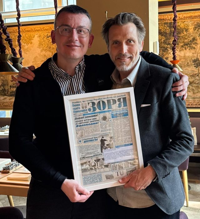 Сьогодні 30.04.2026 р. на знак великої подяки за підтримку шведами української фронтової преси голова Національної спілки журналістів України Томіленко С.А. передав особливий подарунок — оформлений як спеціальний музейний експонат примірник фронтової газети «Зоря» з міста Лиман на Донеччині. Передав президенту Шведської медіабізнес-асоціації Tidningsutgivarna (TU) Йохану Тауберту.