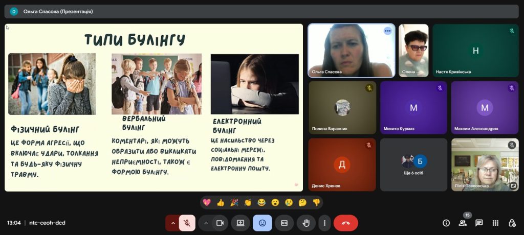 Практична вправа “Скріпочка” надала змогу зрозуміти, що той, хто зазнає знущань не зможе залишатися у первісному вигляді. Вправа «Асоціації з булінгом» надала змогу кожному учаснику озвучити свої негативні вподобання, під час вправи «мозковий штурм» згадували героїв казок, права яких було порушено. Нестандартне мислення виявили під час створення плаката з гаслом проти булінгу і “Стіни підтримки” для жертв насильства.