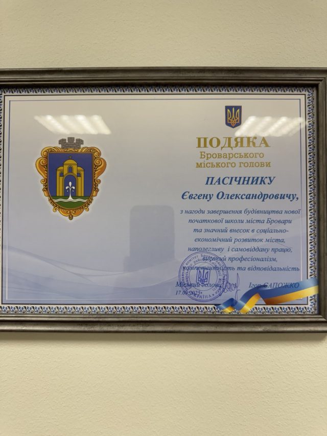 17.09.2025 р. наш земляк Пасічник Євген отримав ПОДЯКУ від міського Броварського голови Ігоря Сапожко з нагоди завершення будівництва нової початкової школи міста Бровари та значний внесок у соціально-економічний розвиток міста, наполегливу і самовіддану працю, високий професіоналізм, компетентність та відповідальність.