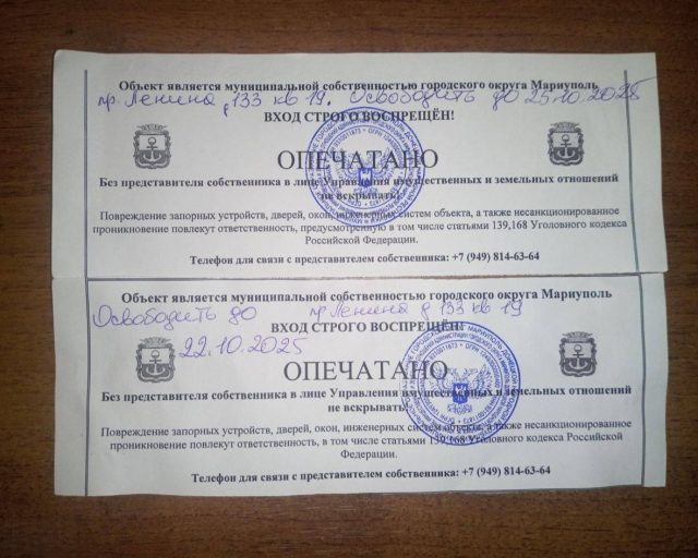 У тимчасово окупованому Маріуполі фіксується нова хвиля привласнення житла місцевих жителів. Окупаційна адміністрація “опечатує” квартири маріупольців, розміщуючи повідомлення із забороною входу до приміщення.